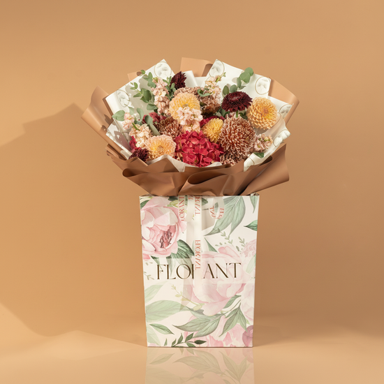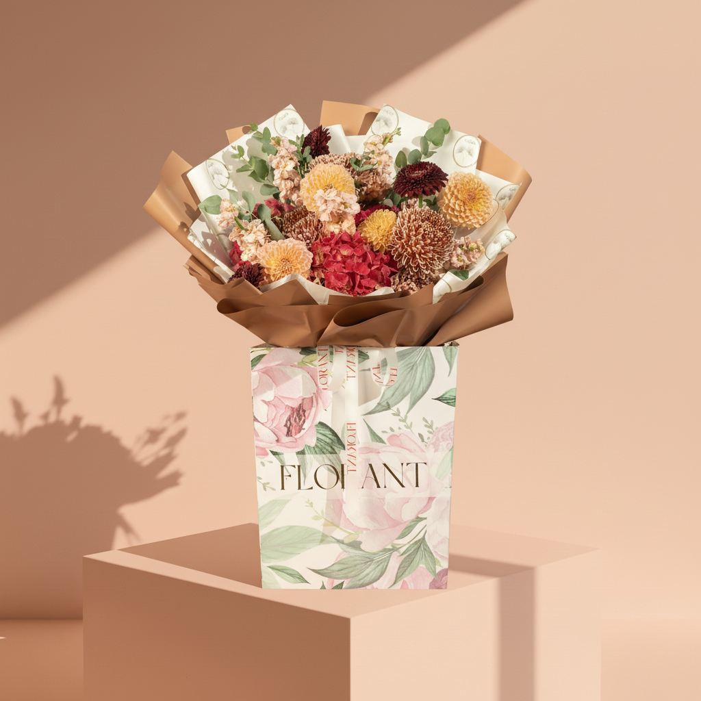 Autumn isn't an ending, it's a celebration of warmth and maturity. Bronze and red dahlias tell stories of beautiful days, and yellow chrysanthemums shine like autumn's gentle sun. Earthy wrapping completes the feeling of warmth and embrace. For warm occasions, for hearts that appreciate every season's beauty, and for those who know autumn has its special magic.