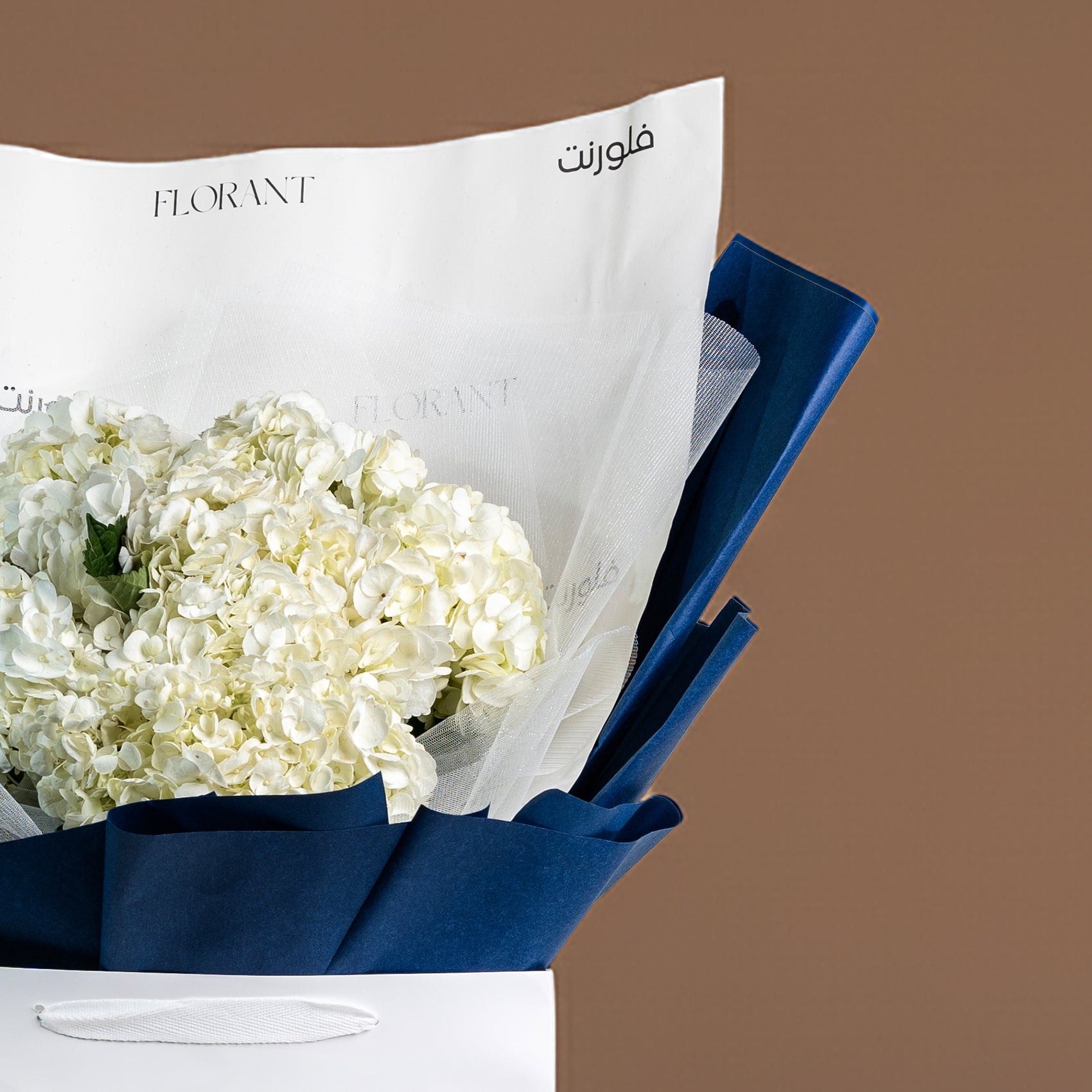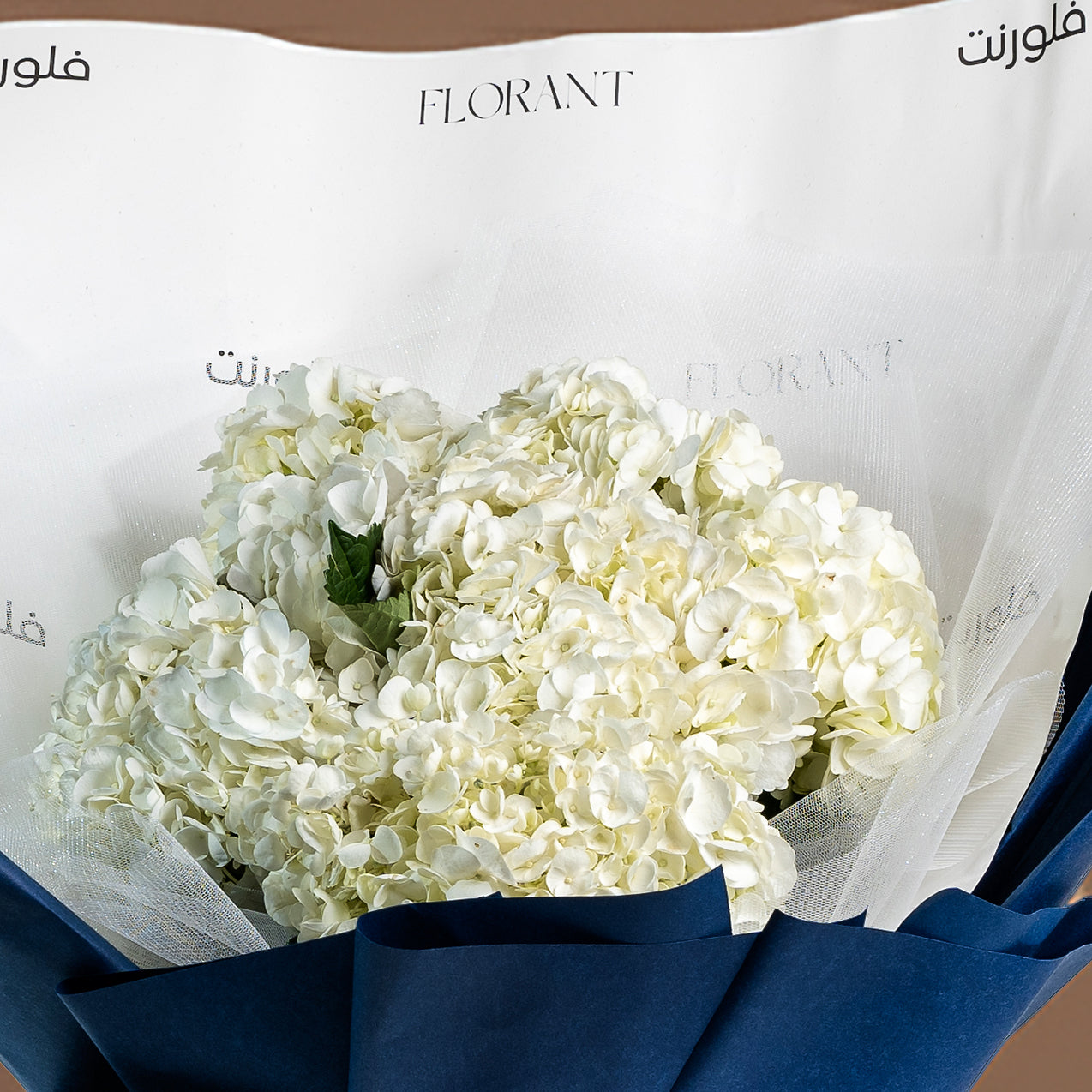 Dense and luxurious white hydrangea, a simple arrangement that highlights the natural beauty and fullness of hydrangea. An elegant classic design in pure white.