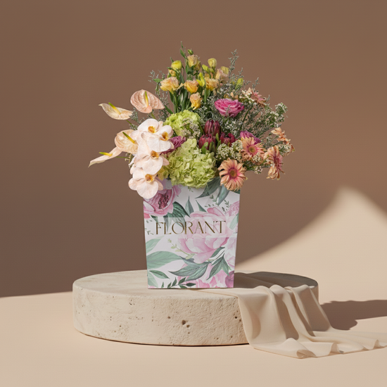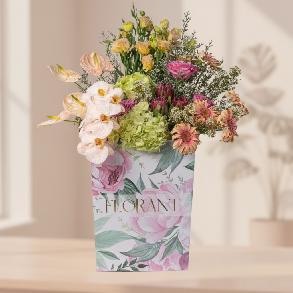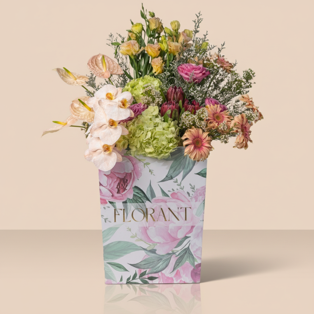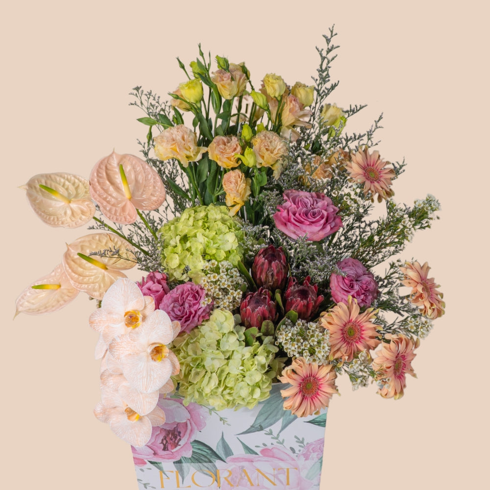Tropical, bold, and completely different. Pink anthurium meets yellow lilies in a celebration of colors and shapes. Green hydrangea adds depth, and branches give the design life and movement. This bouquet is for adventure lovers, those who celebrate difference and believe life is more beautiful when colorful and diverse.
