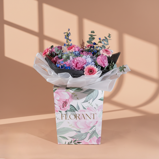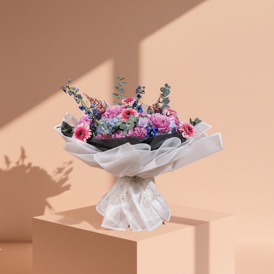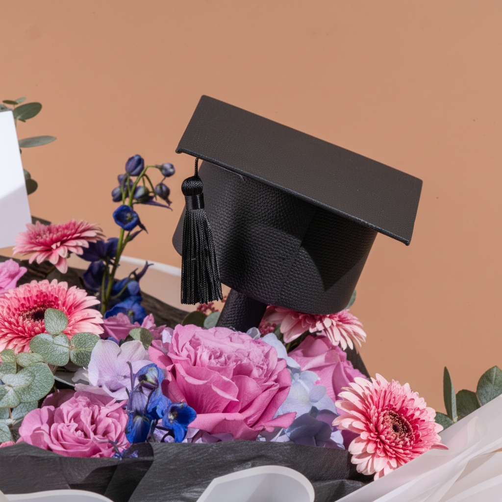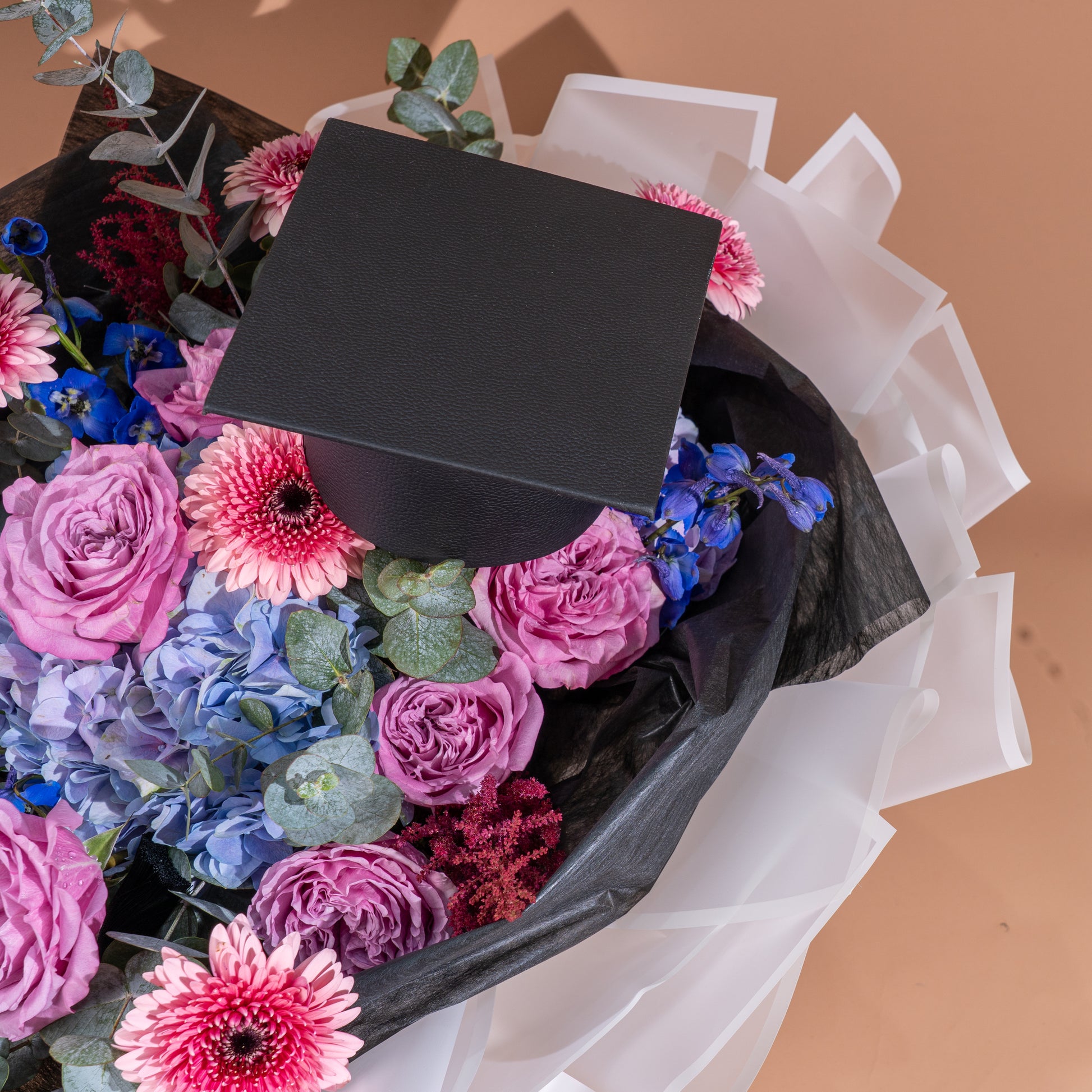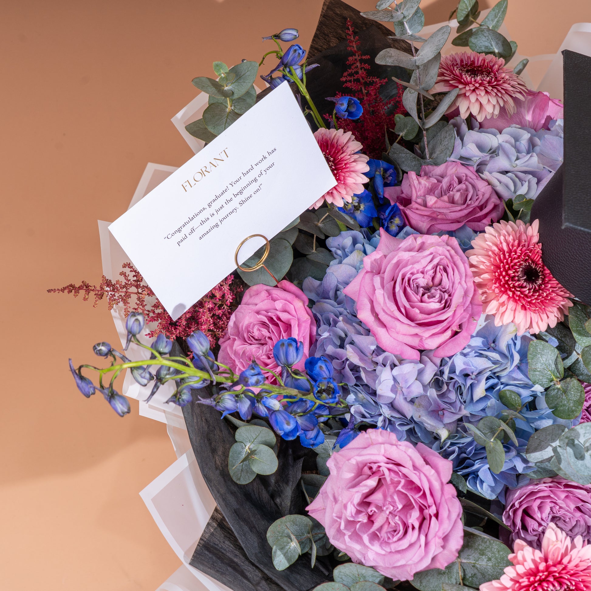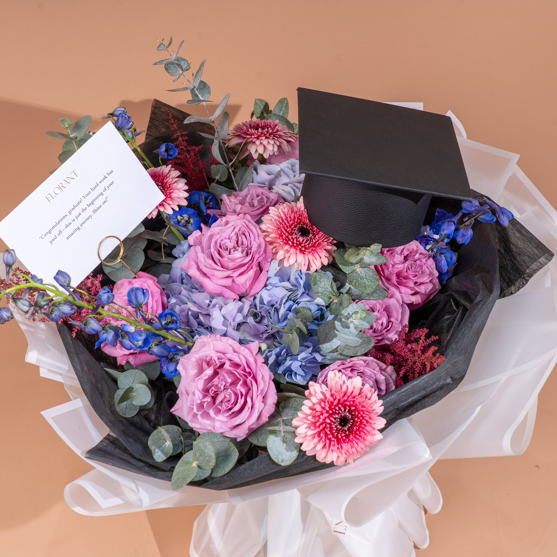 A classy graduation bouquet featuring pink and purple blooms with seasonal floral touches, adorned with a graduation cap and a congratulatory card.