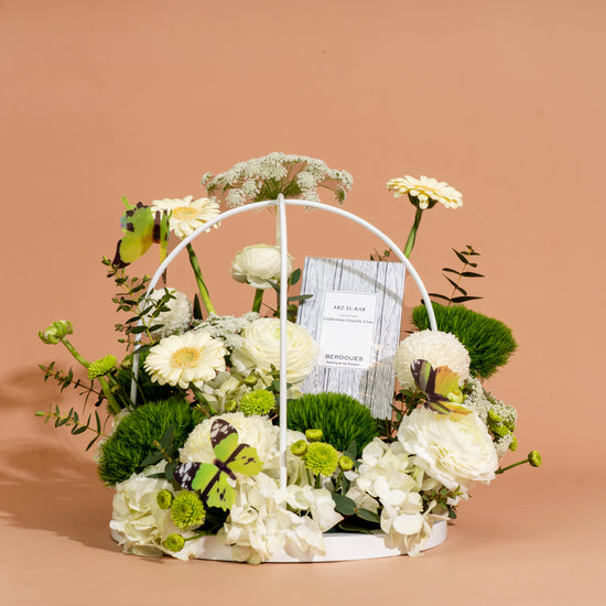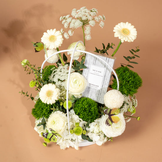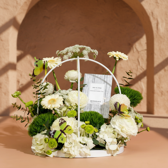 A soft and elegant arrangement featuring White Gerberas, Ranunculus, and Ping Pong blooms, enhanced with the playful texture of Dianthus Trick and fresh green Chrysanthemums. Accents of Ammi Majus and Eucalyptus add a natural flourish. Beautifully arranged on a tray and paired with the refined Berdoues Arz El - Rab 100ml perfume, this set is designed for timeless charm and graceful gifting.