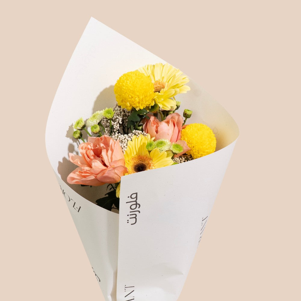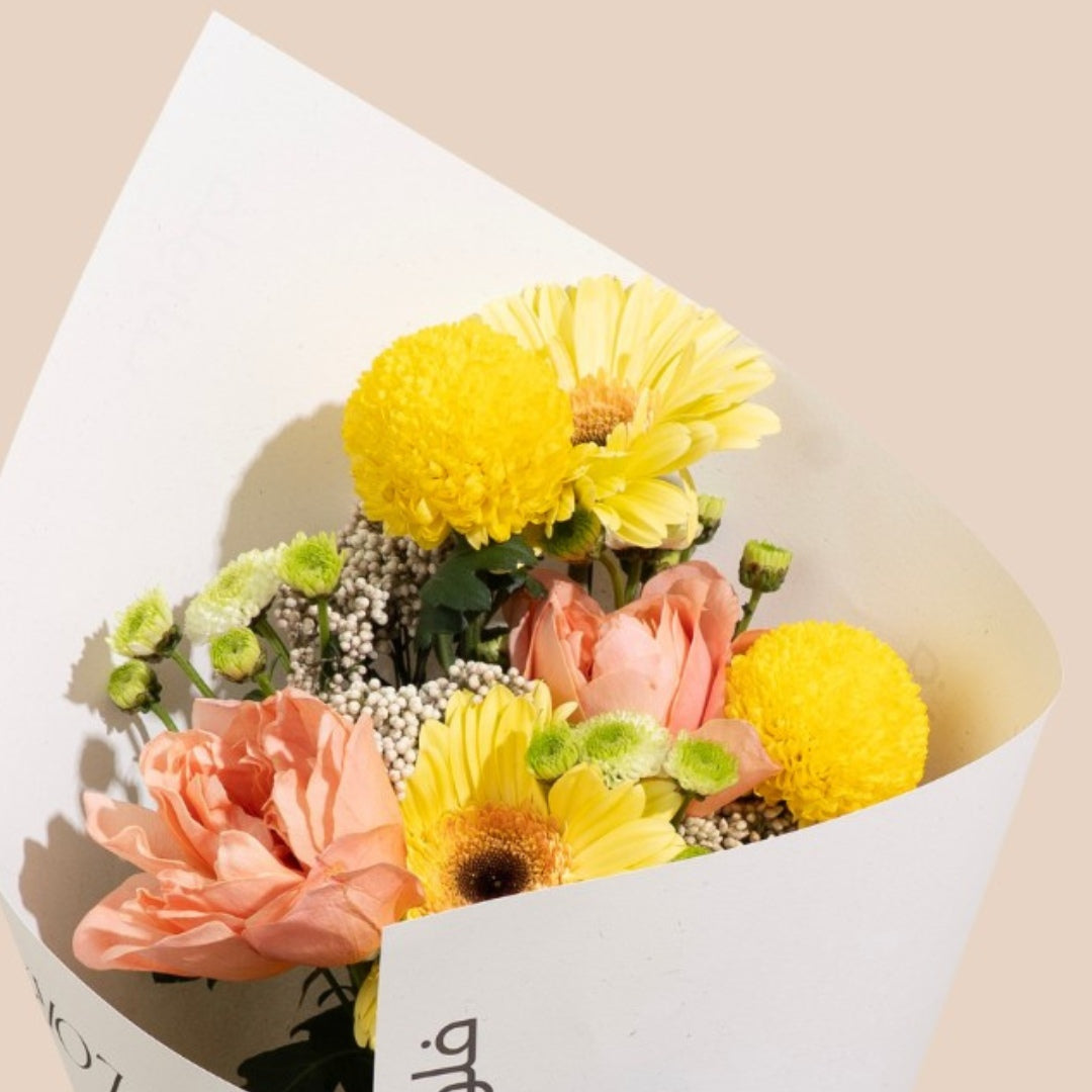 Bright yellow gerberas and sunny yellow pom pom chrysanthemums paired with soft peachy ranunculus. Artfully arranged with green button mums, delicate waxflower, and seasonal foliage, wrapped in our signature Florant minimalist white paper. Embrace the cheerful energy and fresh vibrancy of this uplifting arrangement.
