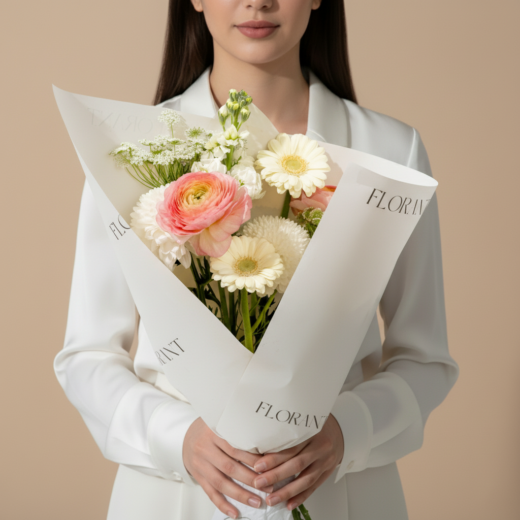 Delicate pink ranunculus paired with crisp white gerberas, elegant white stock, and airy Queen Anne's lace. Artfully arranged with white disbud chrysanthemums and fresh seasonal foliage, wrapped in our signature Florant minimalist white paper. Embrace the serene beauty and timeless elegance of this fresh white arrangement with a blush of color.