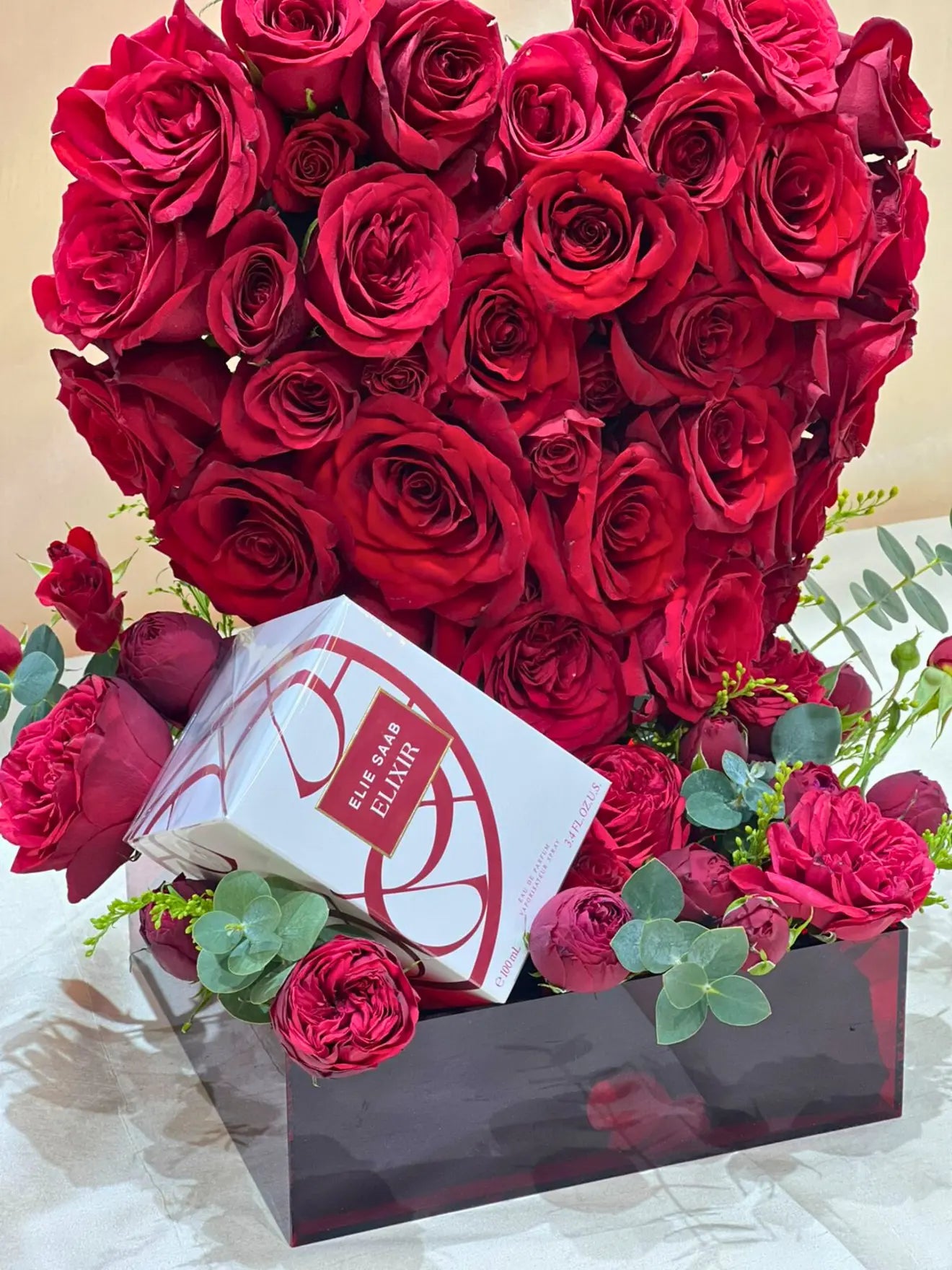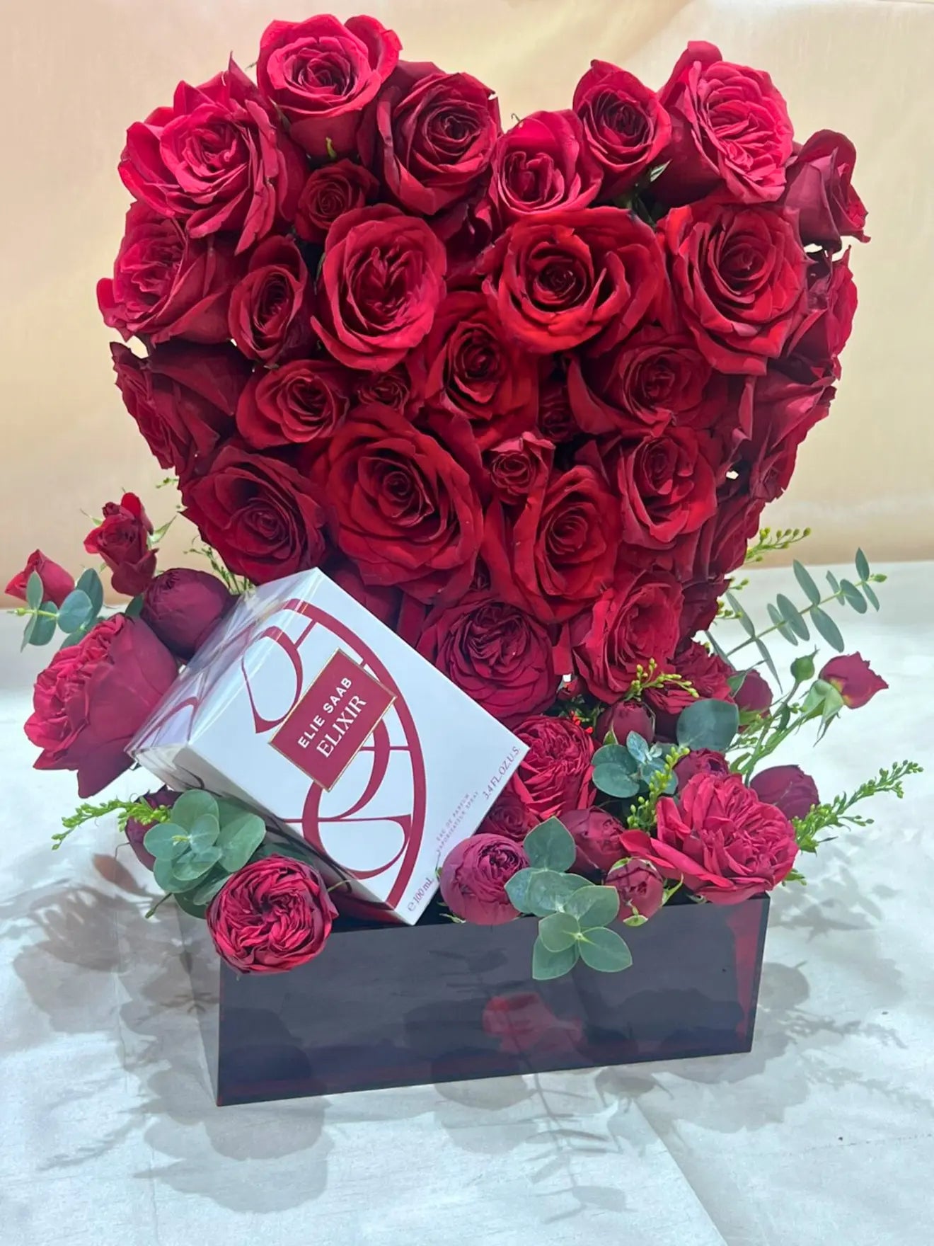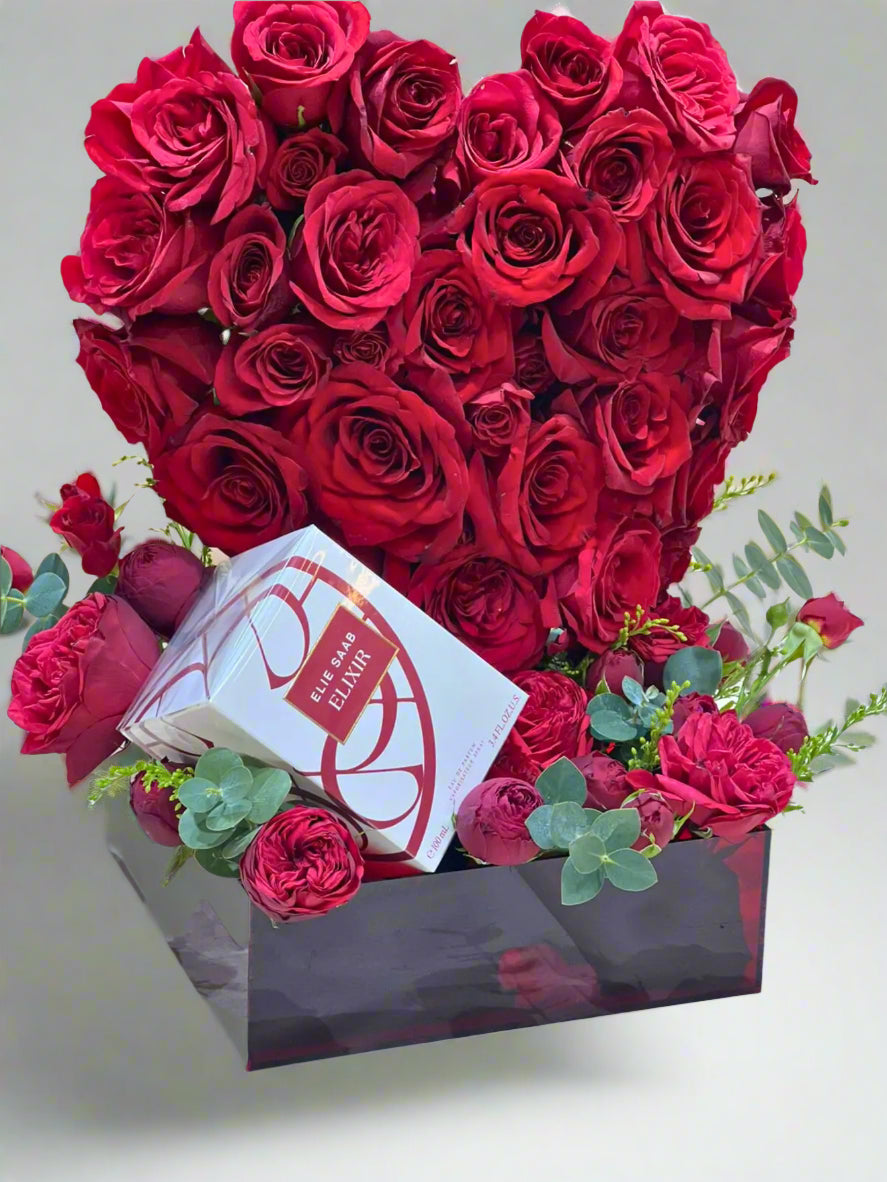 An exquisite flower arrangement featuring 40 fresh roses, beautifully crafted into a heart-shaped design within a clear acrylic box. This elegant and romantic arrangement is the perfect gift to express deep love and affection.