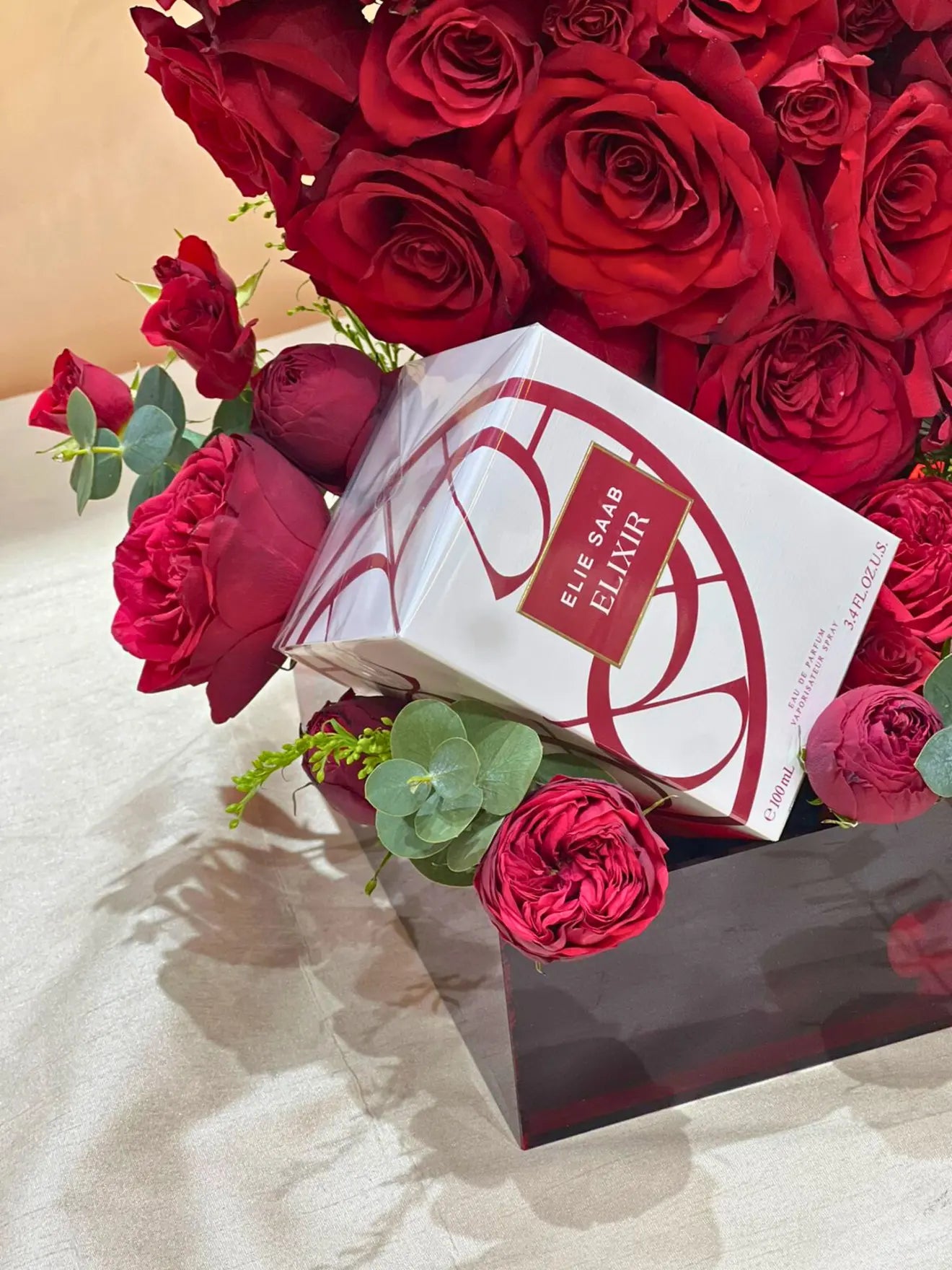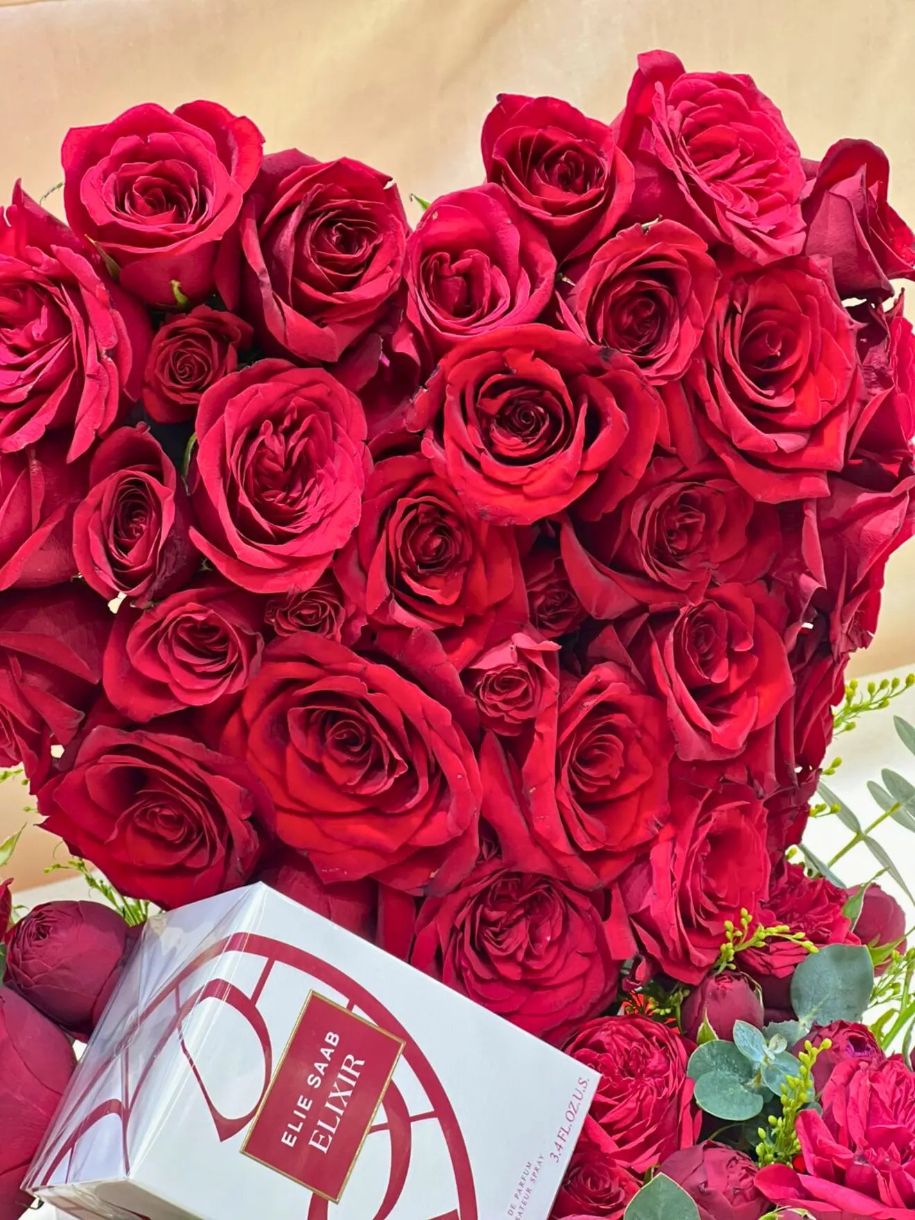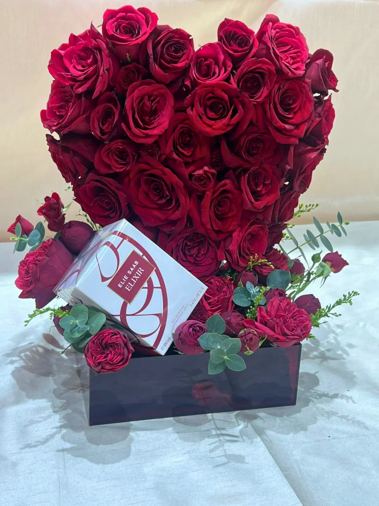 An exquisite flower arrangement featuring 40 fresh roses, beautifully crafted into a heart-shaped design within a clear acrylic box. This elegant and romantic arrangement is the perfect gift to express deep love and affection.