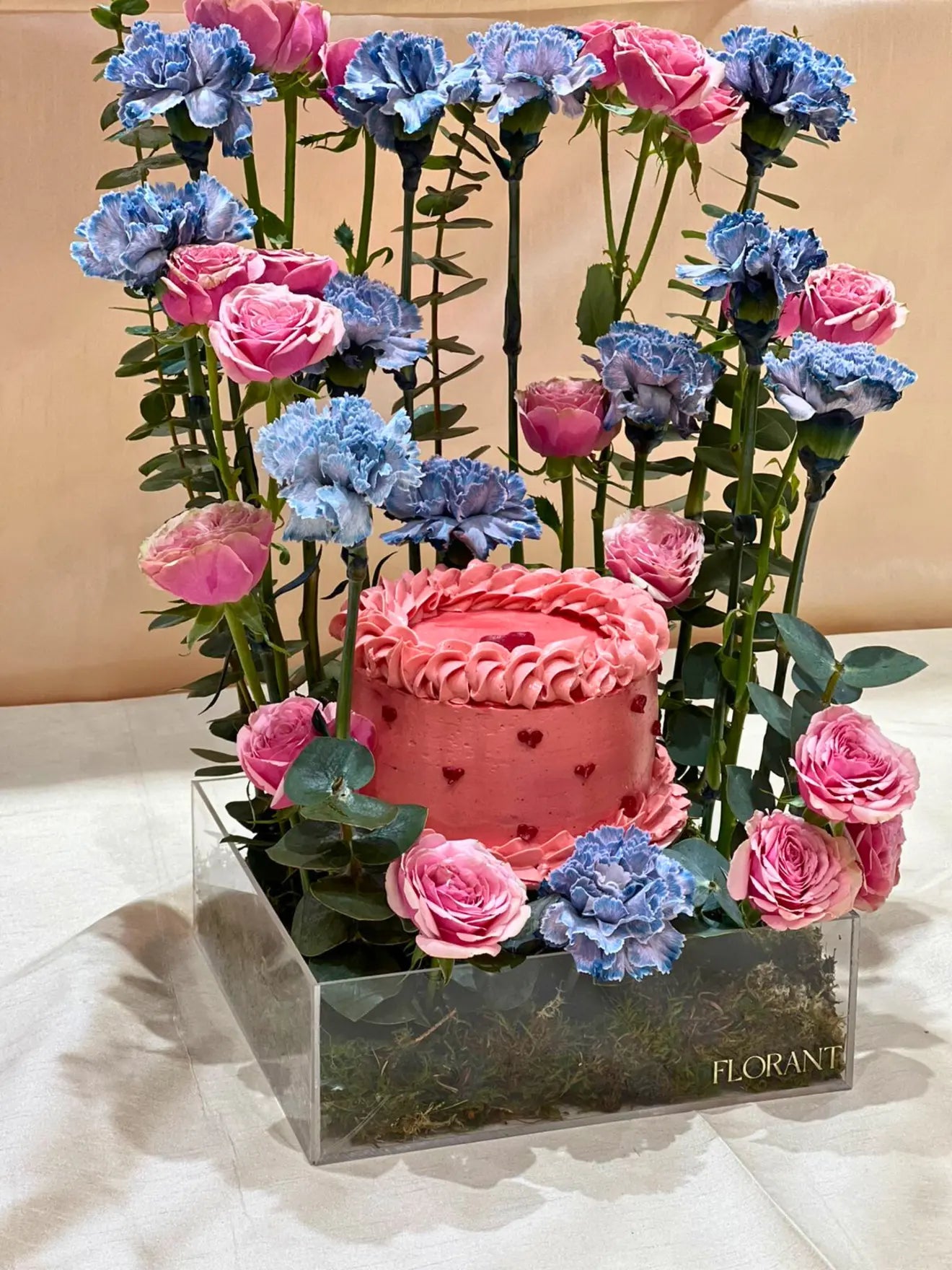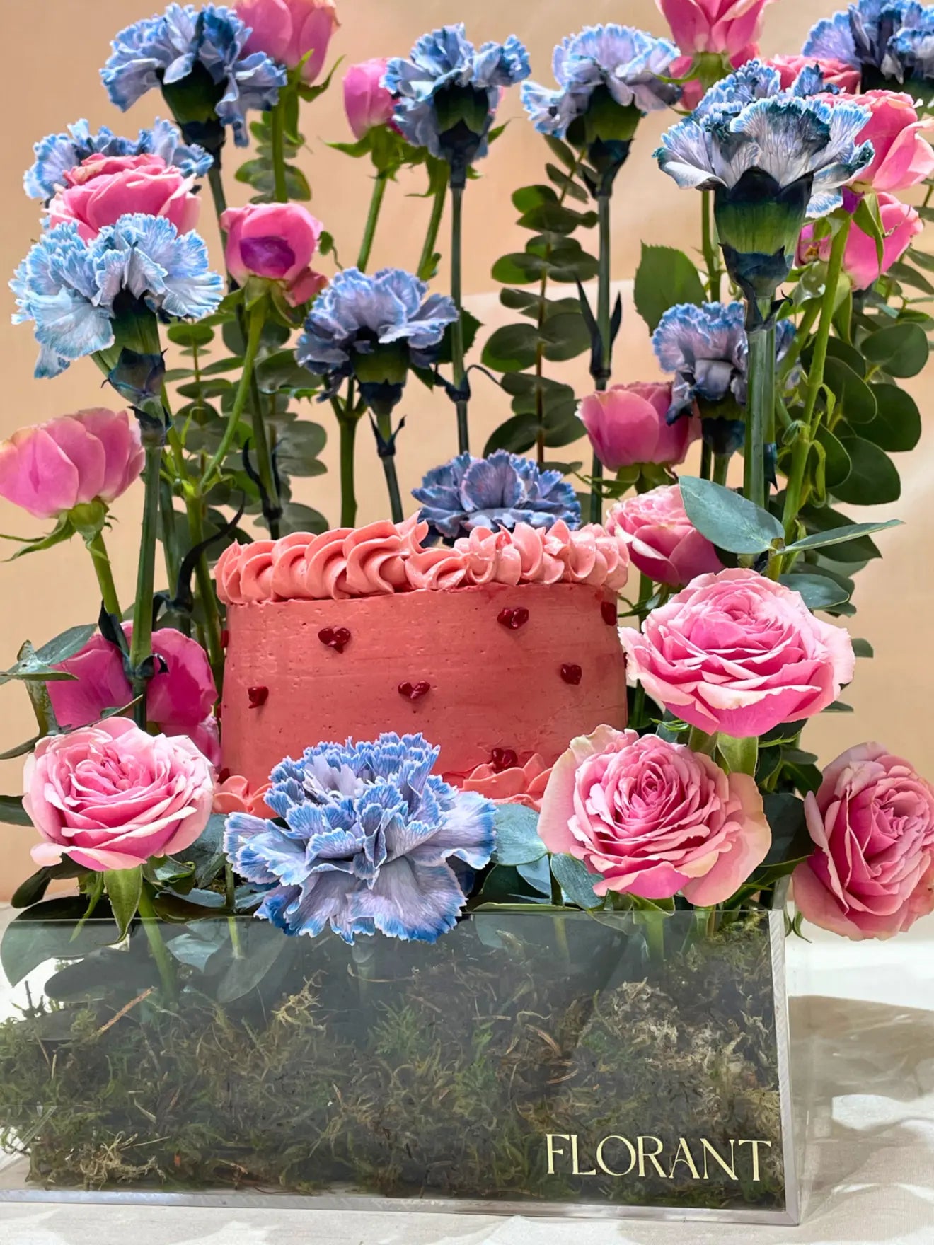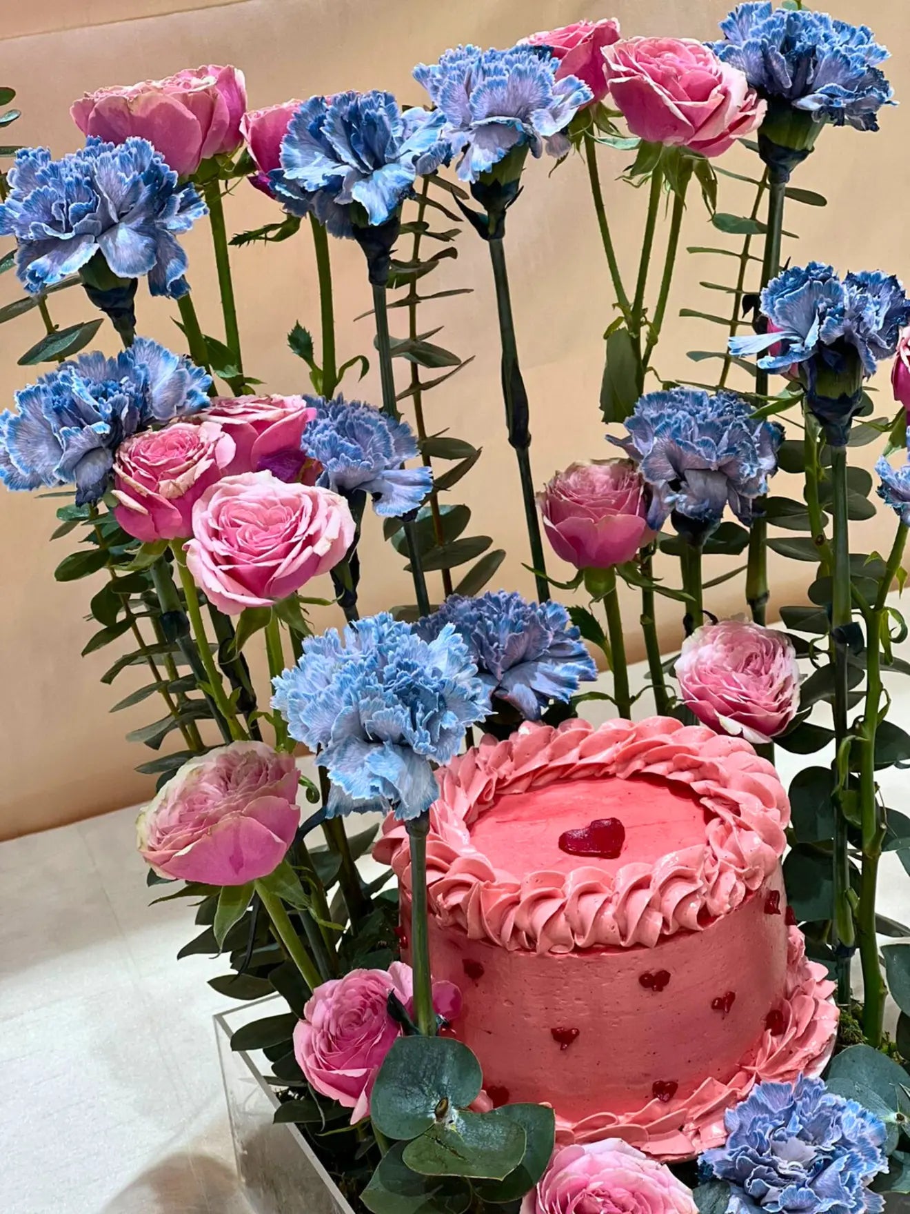 A delightful Valentine’s Day flower arrangement featuring 12 vibrant carnations and 10 charming baby roses. Paired with a beautifully crafted Valentine’s-themed circle cake, this gift is a perfect blend of sweetness and romance for the special day.