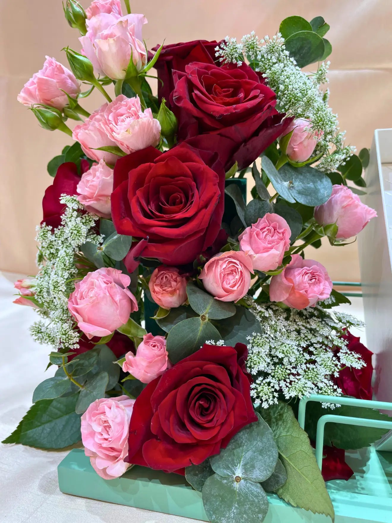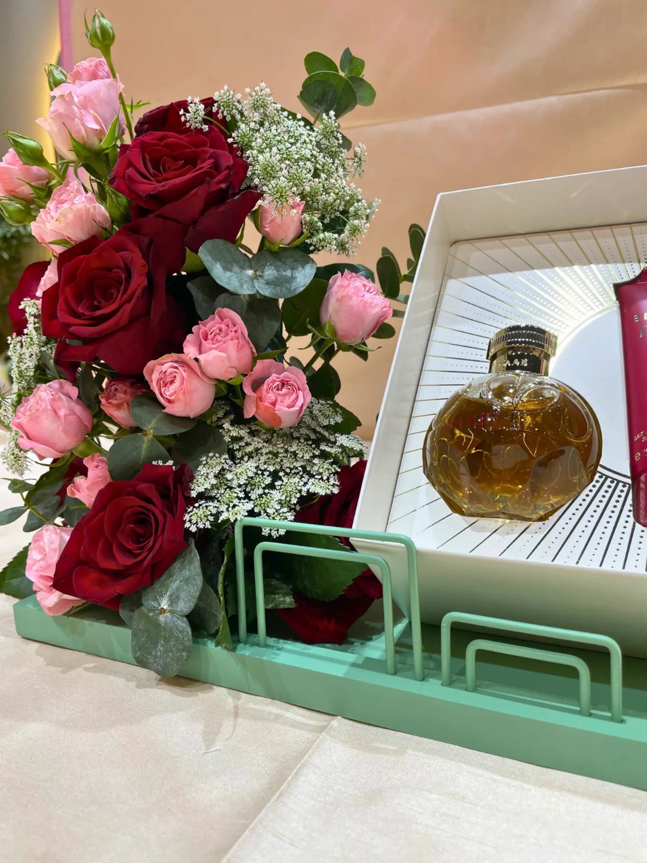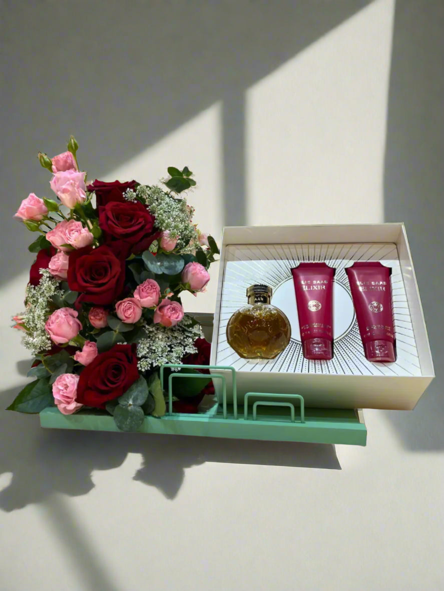 A romantic flower arrangement featuring 7 delicate baby roses, 15 vibrant red roses, and 3 elegant Ammi Majus stems. Paired with an Elie Saab gift set, including a luxurious body lotion and a signature fragrance, this arrangement is the perfect Valentine’s Day gift that exudes love and sophistication.